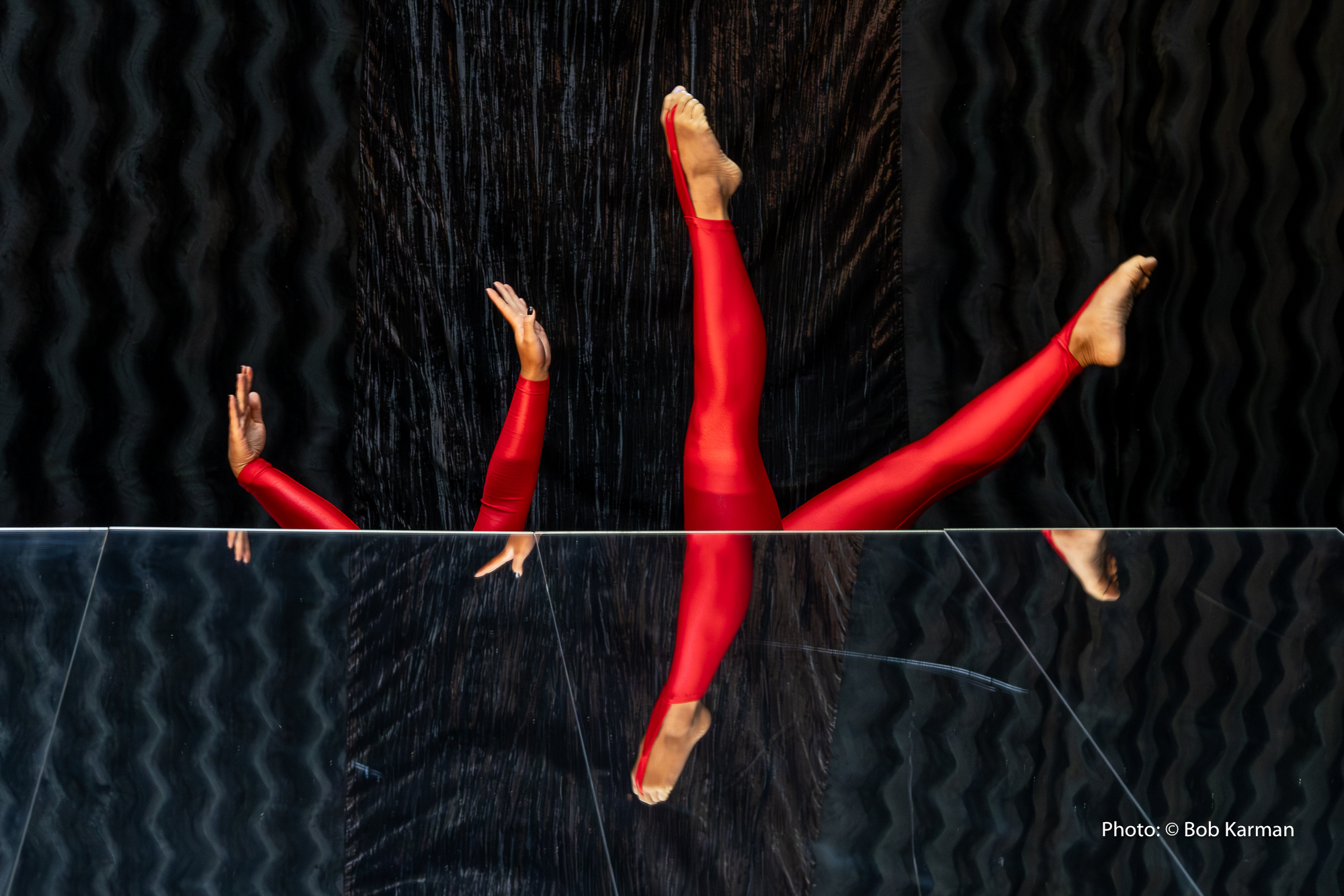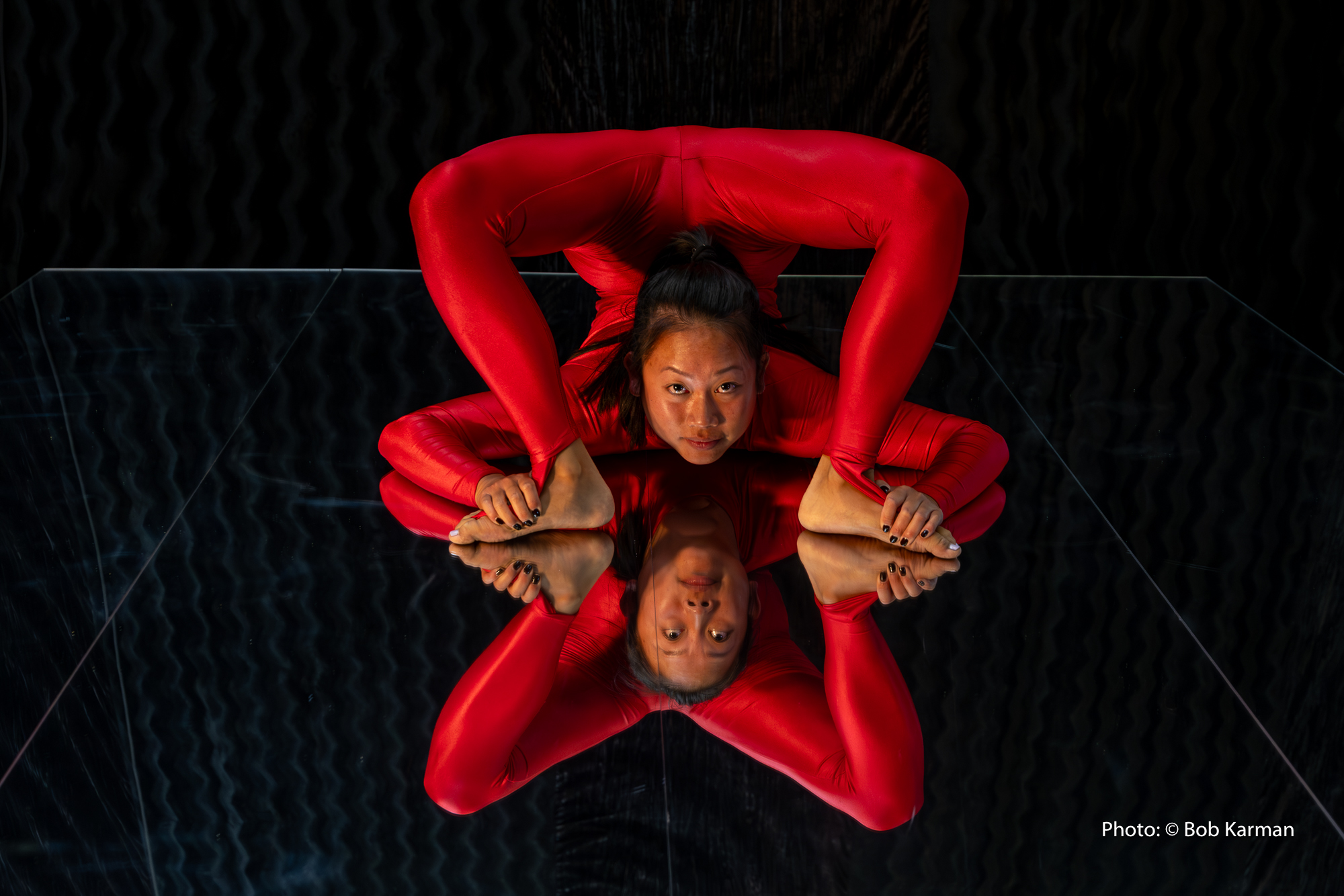 An illusion act on a mirror floor by one or two contortionists.