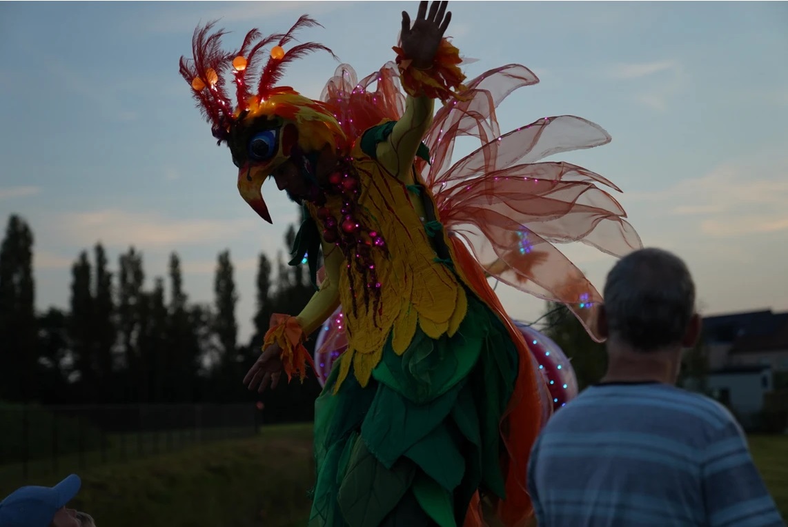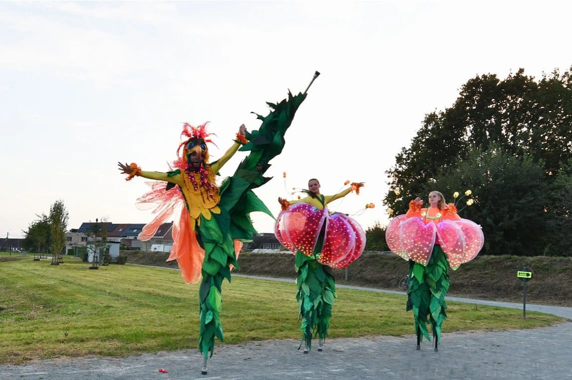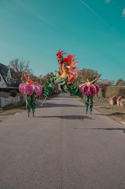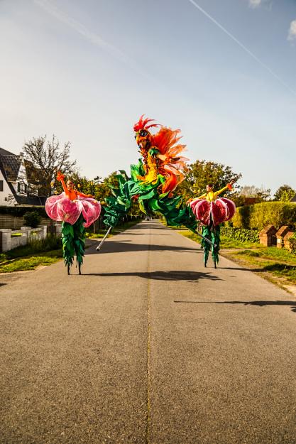 - Equipment: solid tables, 1 chair per artist (to be able to put on the stilts), 1 mirror. If the height does not allow you to put on the stilts inside, there must be a sturdy table and 1 chair per artist outside, out of sight of the audience next to the performance location.