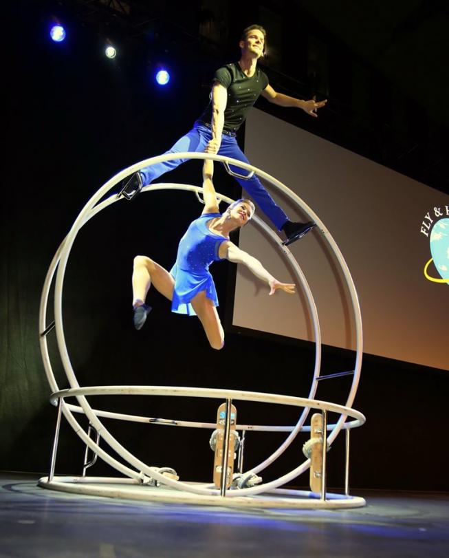 Ein Traum von Akrobatik, Emotion, Kraft und Eleganz. Wenn Sie eine große Räumlichkeit haben, ist die Duo Rhönrad Show die perfekte Wahl. Elegant und mühelos verzaubern das Weltmeister-Duo das Publikum. Erleben Sie eine künstlerische Show aus Höchstschwierigkeiten im Rhönrad kombiniert mit Akrobatik. Dynamisch verschmelzen die Artisten, sie bewegen sich zusammen in einem Rhönrad oder rollen synchron in zwei Rädern. Durch die ständige Bewegung entstehen dynamische Choreographien mit ständig wechselnden Impressionen.