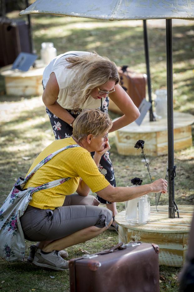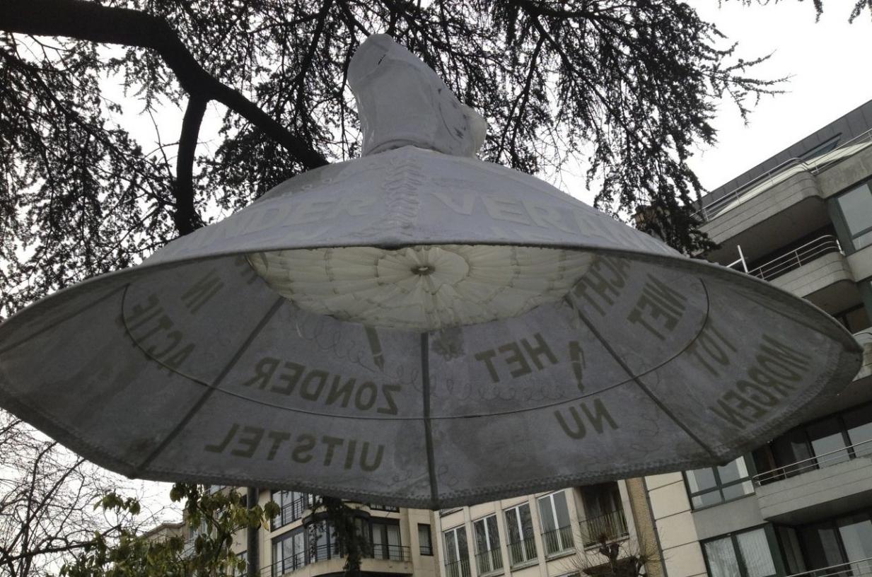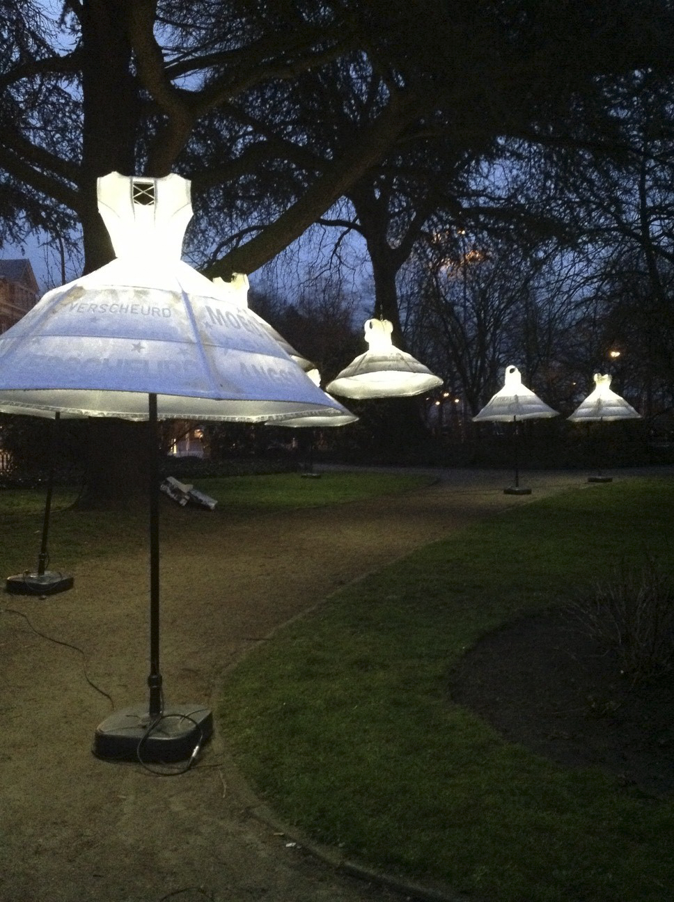 - Als de jurken van de installatie in bomen moeten worden gehangen, hebben we 2 grote ladders nodig. Afhankelijk van de hoogte kan een platform (elektrische ladder) nodig zijn in plaats van de 'normale' ladders.