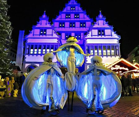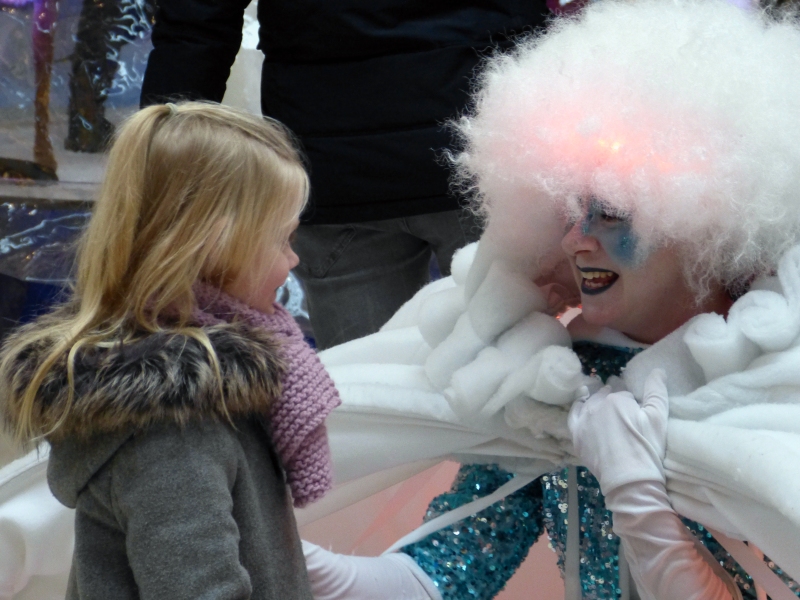 Op het eerste gezicht bestaat de sneeuwballen uit drie enorme witte ballen. Maar wacht tot de reusachtige sneeuwballen tot leven komen! Eerst verspreiden ze een betoverend licht op het plein, dan beginnen ze in opperbeste stemming rond te huppelen. Ze nodigen alle kinderen vriendelijk uit om hun binnenkant te onderzoeken. Daar zien ze een glinsterende sterrenhemel en ze worden getrakteerd op de geur van sinaasappelen en kaneel. Last but not least, zoeken de ballen elkaar op en vormen ze samen een enorme sneeuwpop!